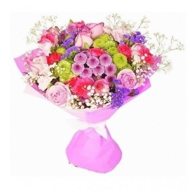 Авторский букет с бигуди-хризантемой, французскими розовыми розами, кустовыми розами и диантусами